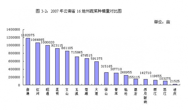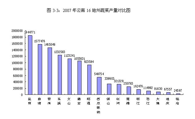 从云南省统计局2007年对云南16地州蔬菜生产量的统计来看,虽然曲靖在云南16地州中蔬菜种植面积规模最大,但是在生产产量上,07年的数字显示,昆明蔬菜产量最大,为1844771吨。其次是曲靖,07年的实际产量为1577476吨。超过100万吨的还有普洱、玉溪、文山、德宏四地区。