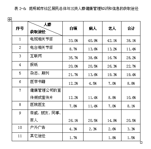 老人通过电视节目获取“健康管理”信息的比例(42.1%)明显高于白领人群(33%)。通过报纸获取相关信息的比例(26.3%)也明显高于白领和病人人群。但通过互联-和亲友获得“健康管理”知识的比例明显低于另外两个人群。